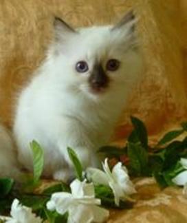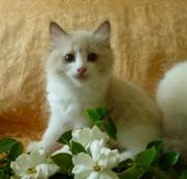 MITTED:   Similar to the Color Point, but with added white “mittens” and boots on the cat’s paws, a white chin, a white bib on the chest, and a white streak along the abdomen.  Sometimes a mitted Ragdoll will also have a white blaze on the nose, which is usually Text Box: BICOLOR:  The lower part of the body is white, while the upper part maintains the color point pattern.  A large inverted “V” white/contract color pattern is on the cat’s face.  They may have a splash or two of white on their backs.  Only their tails, ears, and the outer part of their masks show the darker markings.  The degree of white on the Bicolors varies.  Te nose leather and paw pads are pink.