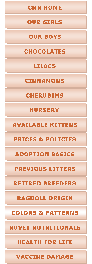 Text Box: MACKEREL TABBY:  This pattern occurs only in the Solid variety of Ragdoll.  This marking pattern has vertical striping and in some cats appears like a “ticking” pattern.  Brown Mackerel Tabbies may appear black and white with diffuse areas of brown (pale beige) throughout the striping pattern.   This is called a “Cold Brown Mackerel Tabby”.  They can also come in other colors, such as Red Tabbies, as this is a marking pattern, not a color pattern.