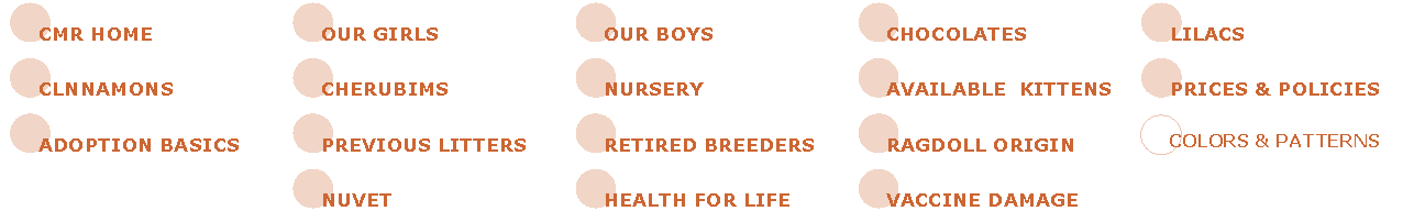 Text Box: LYNX POINT: This pointed variety carries the striped gene, otherwise known as the Tabby marking in the solid Ragdoll.  The Lynx pattern will usually dilute the point color and make it appear lighter than in the Mitted or Color Point versions.  A Seal Lynx Point will generally never have points as dark as it’s Color or Mitted counterpart because the striping breaks up the color making it appear lighter.  The Lynx will usually have a “peach” colored diamond on the nose and appear like it is wearing eyeliner.