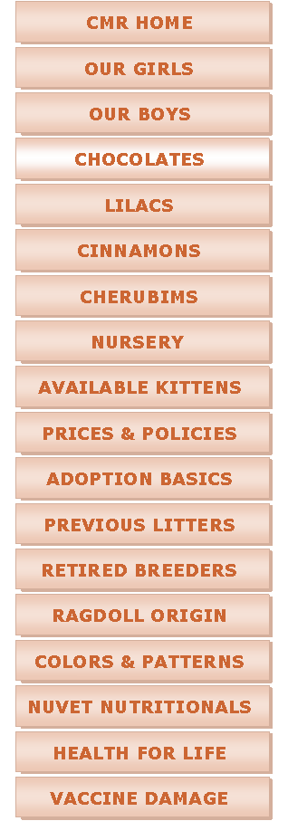 Text Box: Ranger, a traditional chocolate lynx, is about 8 months old in this photo.  Traditional Ragdolls are born almost white.   Ragdolls reach full color by age 3.   Since  chocolate  is a dilute (lighter color), the color  development  takes longer to be visible.